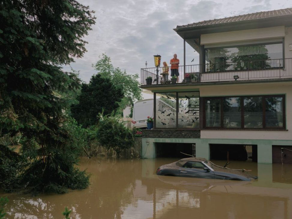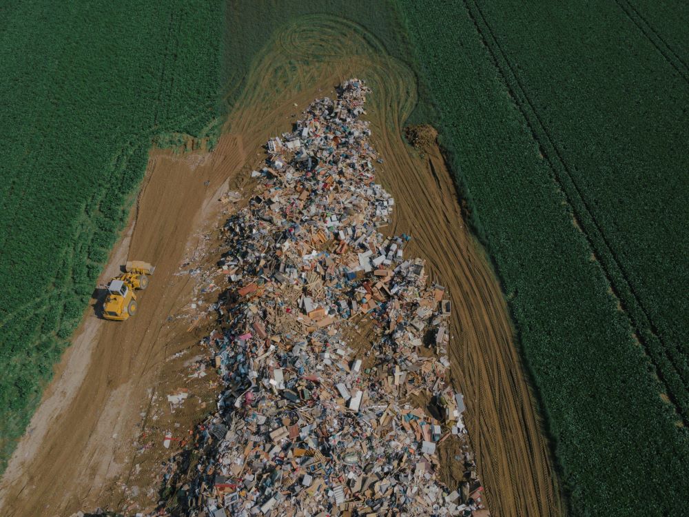 - Rheinbach, 17. Juli 2021. In Rheinbach wurde eine provisorische Sammelstelle für den Müll auf einem Feld eingerichtet. Menschen stehen Schlange, um ihre zerstörten Einrichtungsgegenstände abzuladen. Innerhalb von kurzer Zeit entstand so viel Müll wie sonst in einem Jahr. Aus „Ein Jahr entlang der Ufer“ von Docks Collective