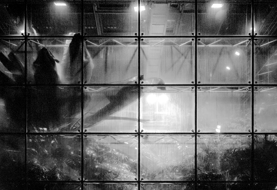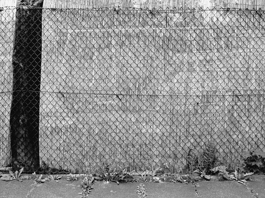 Denn insgesamt sind seine Bilder geprägt von einem ständigen Nicht-weiter-kommen, von sich überlappenden Ebenen, Mauern, Zäunen und Fenstern. Und manchmal auch von allem zusammen, wie beim Foto vom Maschendrahtzaun, hinter dem zusätzlich ein Sichtschutz aus Schilfrohr steht. Die einzige Lücke darin wird wiederum von einem Baum gefüllt, so dass es für den Betrachter definitiv kein Durchkommen geben kann. Zur trostlosen „Garnierung“ wächst am Boden noch ordentlich Unkraut.