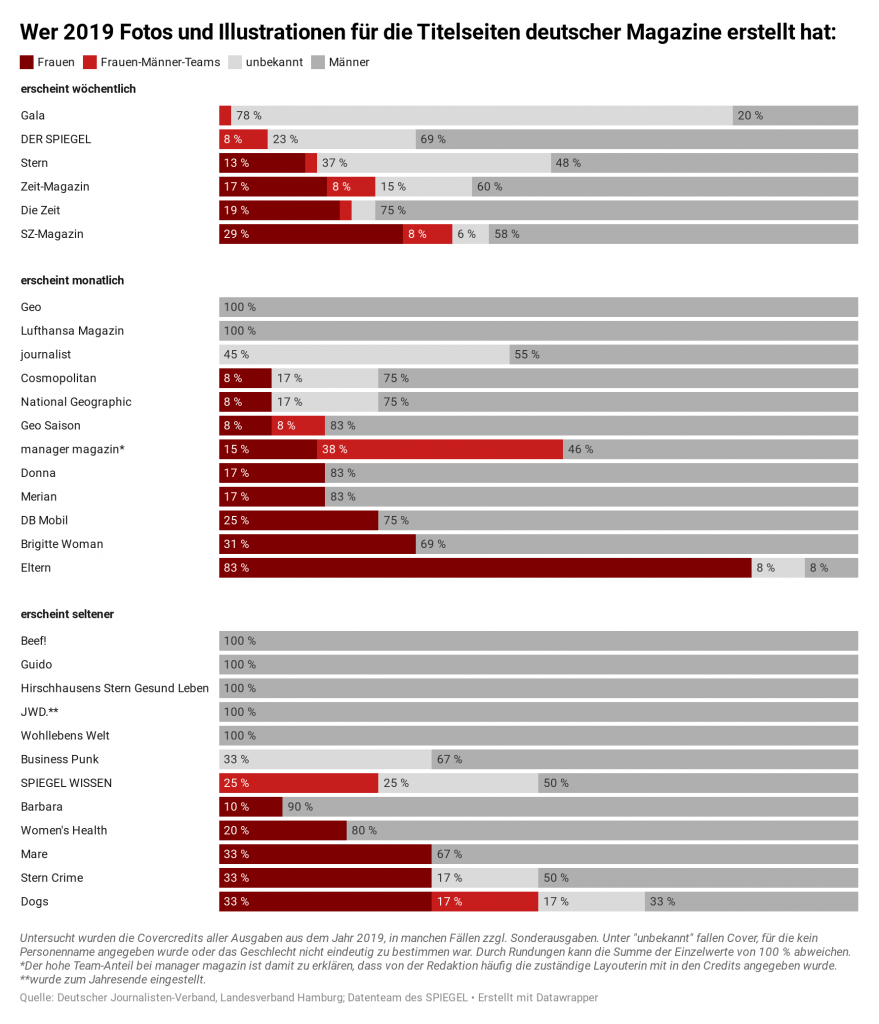 Der Deutsche Journalisten-Verband Hamburg (DJV) hat nun in Kooperation mit dem Datenteam des Nachrichtenmagazins Der Spiegel die Titelseiten von 30 deutschen Magazinen aus unterschiedlichen Fachrichtungen angeschaut und die Credits der Cover aus dem Jahr 2019 ausgewertet. Das Ergebnis war mehr als ernüchternd: Bei sieben Magazinen wurde kein einziges Cover von einer Frau fotografiert oder illustriert und auch bei den anderen Magazinen dominierten die Männer auf den Titelseiten. Lediglich bei „Eltern“ gab es mehr Titelseiten, die von weiblichen Fotografen und Illustratoren stammen.
