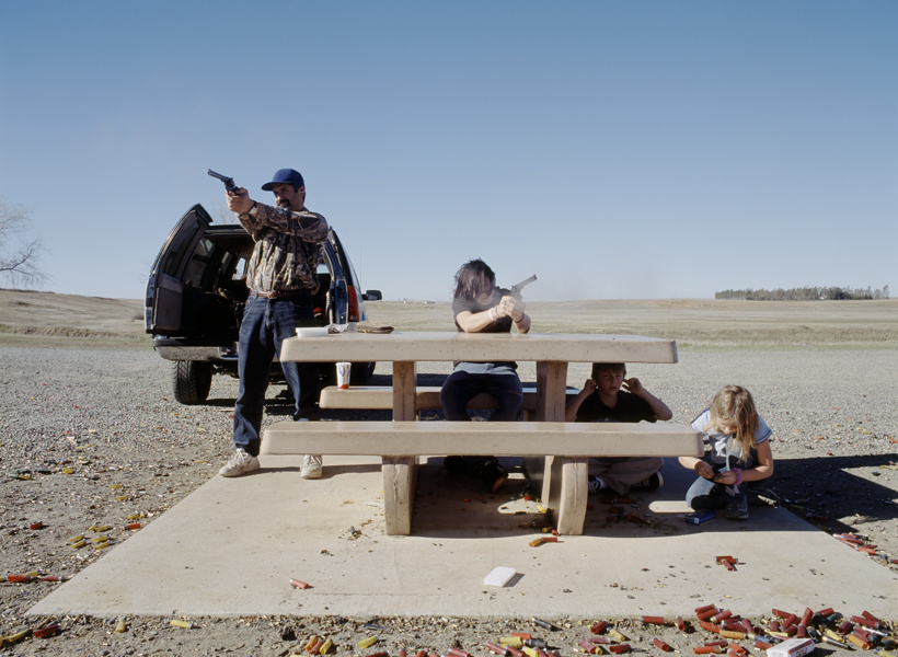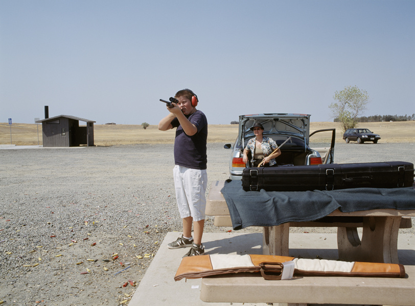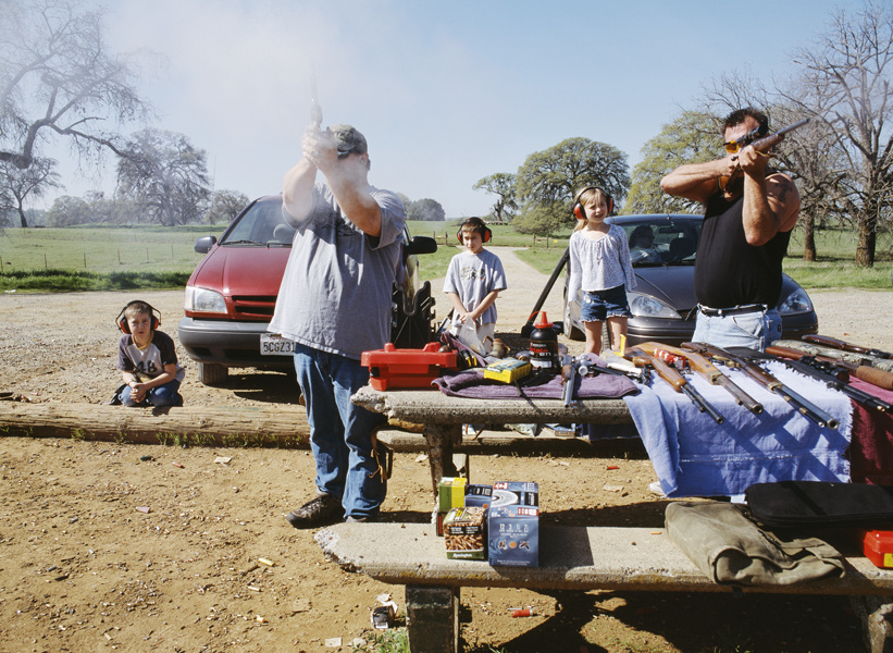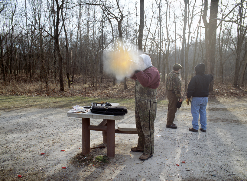 Die Fotografien des 1976 geborenen Greg Stimac wirken grotesk und lächerlich. Das Lachen bleibt dem Betrachter jedoch im Halse stecken – nicht zuletzt deswegen, weil die Männer und Kinder scheinbar direkt auf den Fotografen schießen: Stimac hatte seine Mittelformatkamera auf dem Platz unmittelbar vor den Schützen platziert. Mittels eines Fernauslösers war es im möglich, die Bilder unbeschadet in den Augenblicken zu schießen, in denen auch die Protagonisten das Feuer eröffneten. Weißer Rauch und Mündungsfeuer zeugen davon, in einem Bild meint man sogar die fliegende Kugel erkennen zu können.