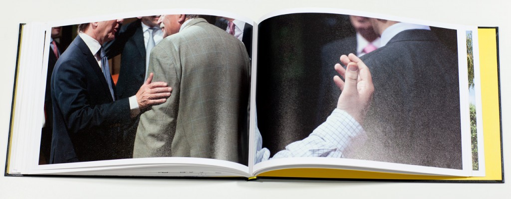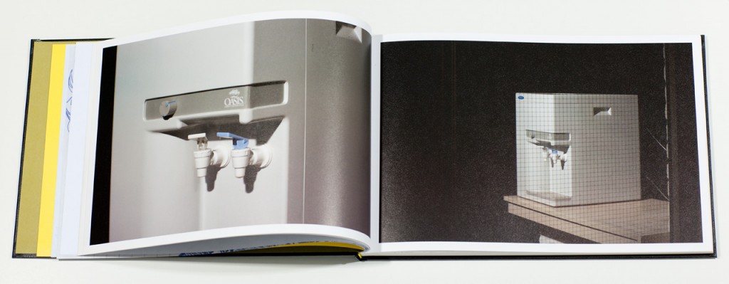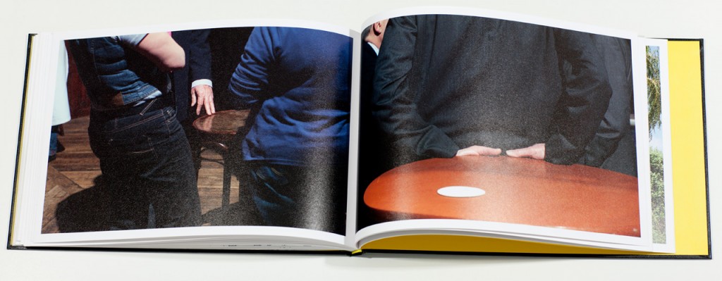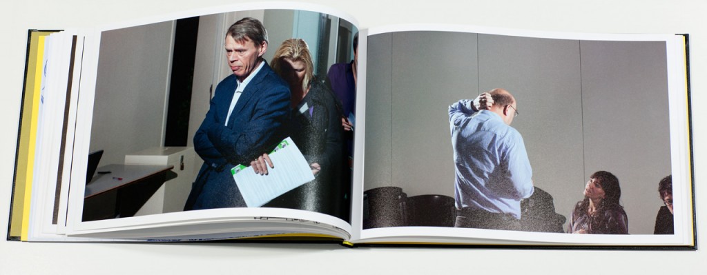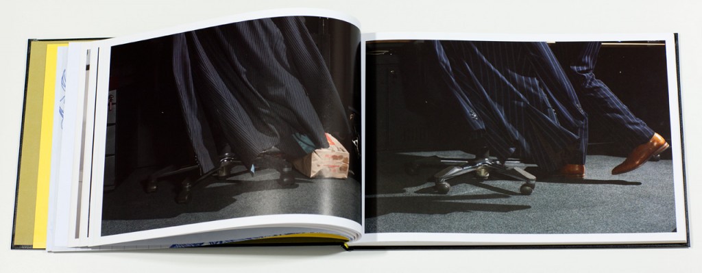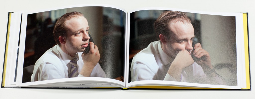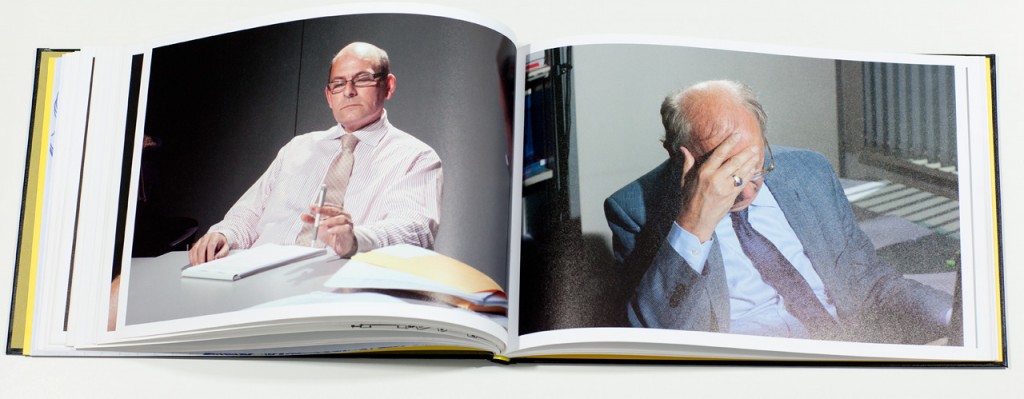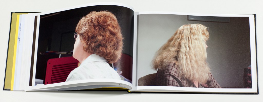 Durch den Einsatz eines seitlich aufgestellten Blitzlichtes hat er auf sehr einfache Art und Weise intensive Bilder von isoliert wirkenden Menschen geschaffen – sie stehen alleine am Kopiergerät, konsterniert in einer Warteschlange oder sitzen fast verzweifelt an ihrem Schreibtisch. Aber selbst in Gruppen wirken seine Protagonisten nie zusammengehörig, sondern genauso deplatziert wie die Luftballons, die von der Bürodecke hängen. Die sind ja immer irgendwie grotesk und trostlos – ich kenne das noch sehr gut aus meiner Zeit, in der ich regelmäßig in den Redaktionen von Kölner Tageszeitungen saß. Aber so, wie van Roekel sie fotografiert, bekommen die Ballons und der schwachsinnige Papierschmuck drumherum beinahe etwas Fratzenhaftes und Bedrohliches. Das gleiche gilt für die Porträts von Hinterköpfen – schließlich sieht man von den sogenannten Kollegen und Mitarbeitern im Büro die meiste Zeit genau das.