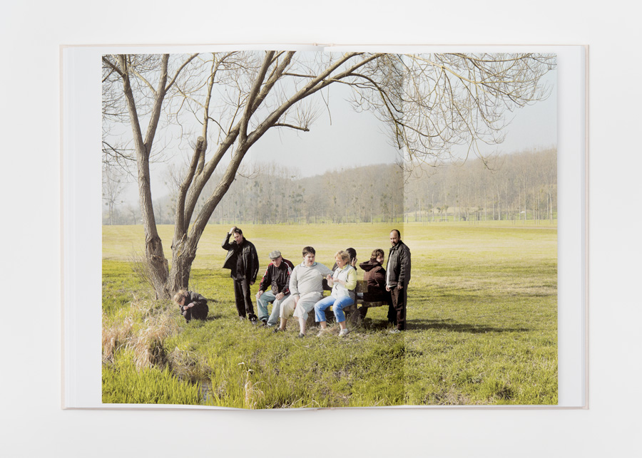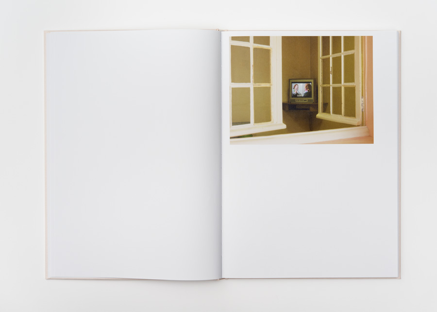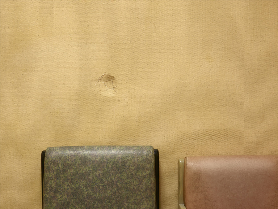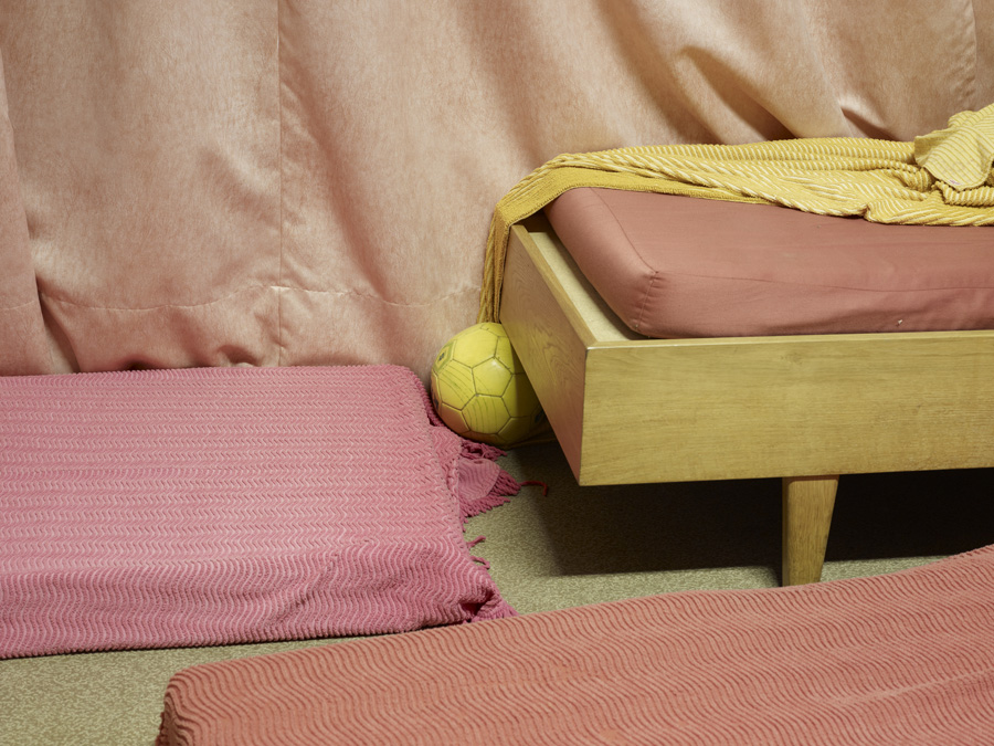 Konsequent ist auch, dass wir im gesamten Buch keinen einzigen Buchstaben finden, der von den Bildern ablenkt. Der einzige Text wurde auf eine Klappkarte ausgelagert und auch die wenigen Außenaufnahmen sind herausnehmbar. Dafür klebt auf dem Cover eine kleine Plastikhülle, in dem ein Foto steckt wie in den Kliniken normalerweise die Namen der Patienten am Bett. Es zeigt einen leuchtend gelben Fußball, eingeklemmt zwischen rosaüberzogenen Matratzen und Wänden. Lebensfreude sieht anders aus.