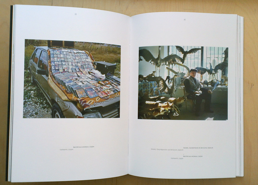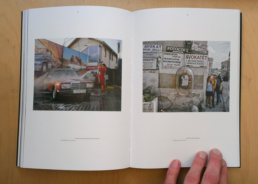 Das Buch öffnet dann auch mit einem Foto, das verdeutlicht, dass es ein weiter Weg gewesen sein muss bis dahin: Es zeigt den Schriftzug „Kosovo Pavarsi“, was so viel wie „unabhängiges Kosovo“ bedeutet, als Graffito auf einer verrosteten Leitplanke auf einer scheinbar einsamen, auf jeden Fall eher ländlich gelegenen Straße irgendwo imNirgendwo. Die folgenden Aufnahmen aus Pristina sind nicht minder pessimistisch: Schnee auf einem Pickup, das mit einem Airbrush eines Surfers im Sonnenuntergang verschönert wurde; Kinder beim Schlittenfahren in einer Wohnsiedlung, wobei der Schnee bereits zu einer dunkelbraunen Matsche zerfahren wurde; zerfetzte Wahlplakate auf einem Zaun, der wie Gitterstäbe wirkt. Es folgen Porträts und Landschaften, mal eher nüchtern, dann wieder doppeldeutig, poetisch, absurd fotografiert. Der Viehmarkt in Lipjan mit seinen Pferdegespannen lässt einem an der Zukunftsfähigkeit dieses arg gebeutelten Landes zweifeln, direkt danach folgen Bilder von neugebauten Industriezonen und das tiefe Loch eines Fundaments, auf dem ein Einkaufszentrum entstehen soll.