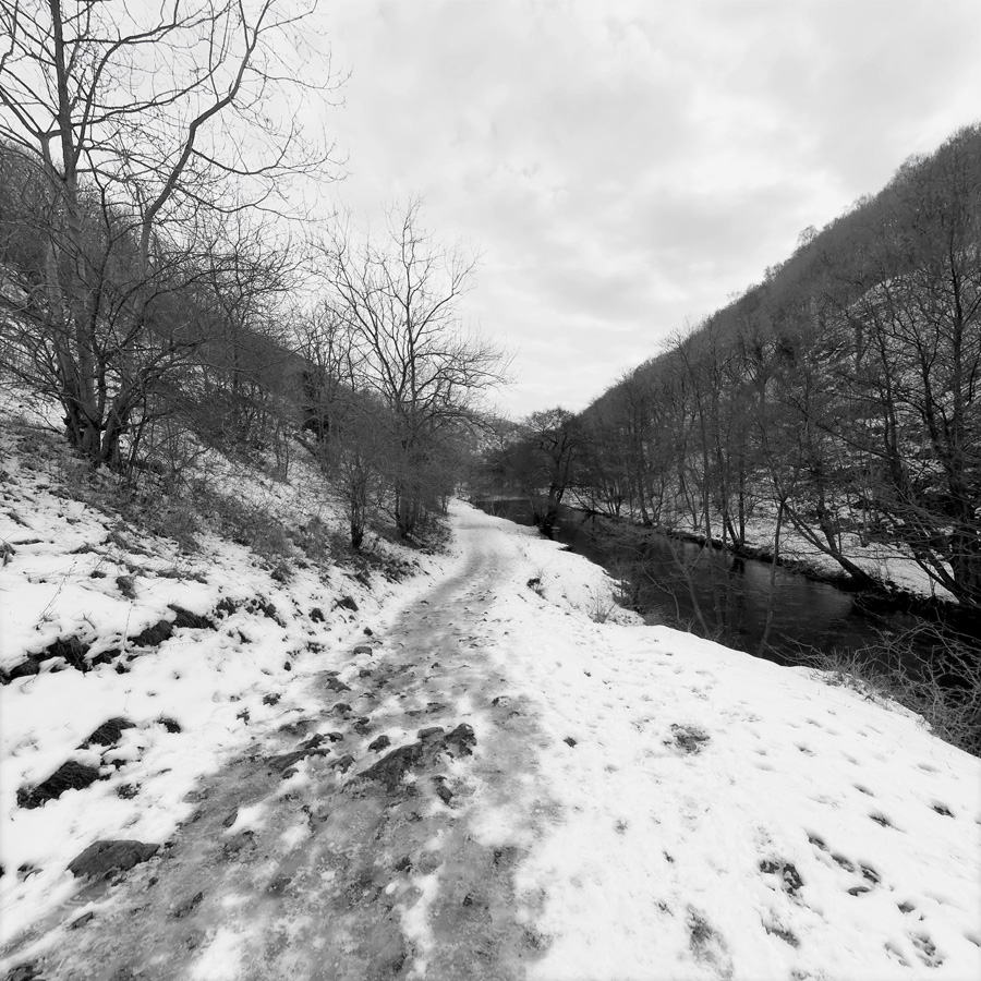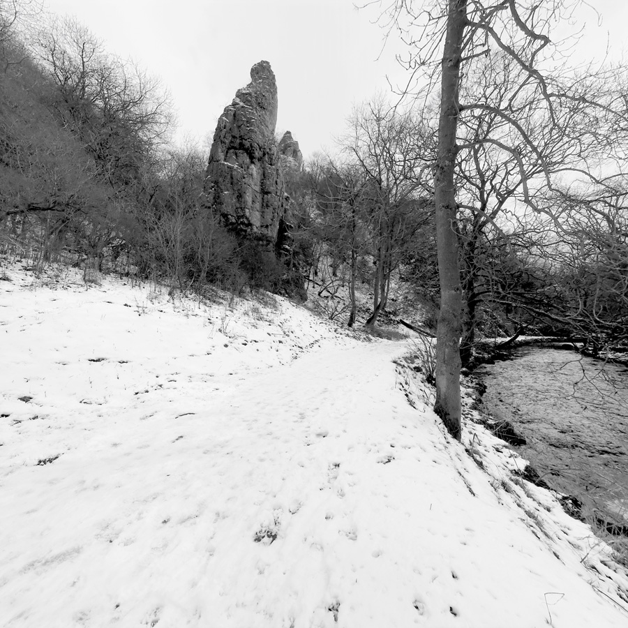 Unter die Rubrik „Klein, aber fein“ fällt die Ausstellung „Dovedale“ des bekannten Konzeptkünstlers Victor Burgin in der Galerie Thomas Zander. Neben einer Videoarbeit, in der Burgin das Gemälde „Dovedale im Mondlich“ von Joseph Wright of Derby aus dem Jahr 1785 „abfährt“ und es so dekonstruiert und zugleich neue Landschaften kreiert, gibt es noch eine kleine Fotostrecke mit Schwarzweiß-Aufnahmen. Die entstanden an dem Ort, der in Wrights Gemälde dargestellt wird – allerdings mit einigen Unterschieden.